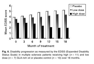 Zaczniemy od najważniejszej rzeczy, czyli skuteczności. Wszystko ładnie widać na tym wykresie: Widać tam 3 grupy pacjentów - wszyscy zaczynali z tego samego poziomu, który na skali EDSS wynosił mniej więcej 4 punkty. Różnice w pierwszym słupku biorą się stąd, że wyznacza on średnie samopoczucie pacjentów w ciągu 3 miesięcy - kiedy terapia zaczęła już działać. Na samym początku eksperymentu nie było żadnych różnic. Cztery punkty na skali EDSS oznaczają: Pełna mobilność bez pomocy, pacjent samowystarczalny, potrafi funkcjonować ponad 12 godzin dziennie pomimo poważnych utrudnień, zdolny do przebycia bez pomocy i odpoczynku około 500 metrów. Grupa, która otrzymywała placebo, po 18 miesiącach badania miała średnio nieco ponad 5 punktów na skali, co oznacza: Zdolny do przebycia bez pomocy i odpoczynku około 200 metrów, ostra niewydolność układu funkcjonalnego, wystarczająca by uniemożliwić pełną aktywność (np. pracę przez cały dzień w warunkach nieprzystosowanych). Grupa otrzymująca niskie dawki GLA pozostała na takim poziomie, z jakiego zaczynała badanie. To, co najbardziej nas interesuje - grupa otrzymująca duże dawki GLA (14 ml oleju z ogórecznika dziennie). Pacjenci w tej grupie mieli średnio 2 punkty na skali pod koniec eksperymentu. 2 punkty oznaczają: Liczne drobne objawy niewydolności jednego elementu układu funkcjonalnego. W praktyce oznacza to, że ludzie którzy ledwo byli w stanie dojść do sklepu przed podjęciem terapii, po jej zakończeniu mieli np jedynie lekkie drżenie rąk. Choroba u nich cofnęła się. Kolejna ważna rzecz, o której wspomniano w badaniu - testy czerwonych krwinek wykazywały, że poziom GLA w ich błonie komórkowej wracał do "normalnego" poziomu po upływie dopiero 2 lat. Oznacza to też, że przynajmniej tyle powinna trwać terapia aby uzyskać pełen efekt - wszystko wskazuje na to, że tym efektem jest pełne zatrzymanie choroby oraz cofnięcie się sporej ilości zmian. |
